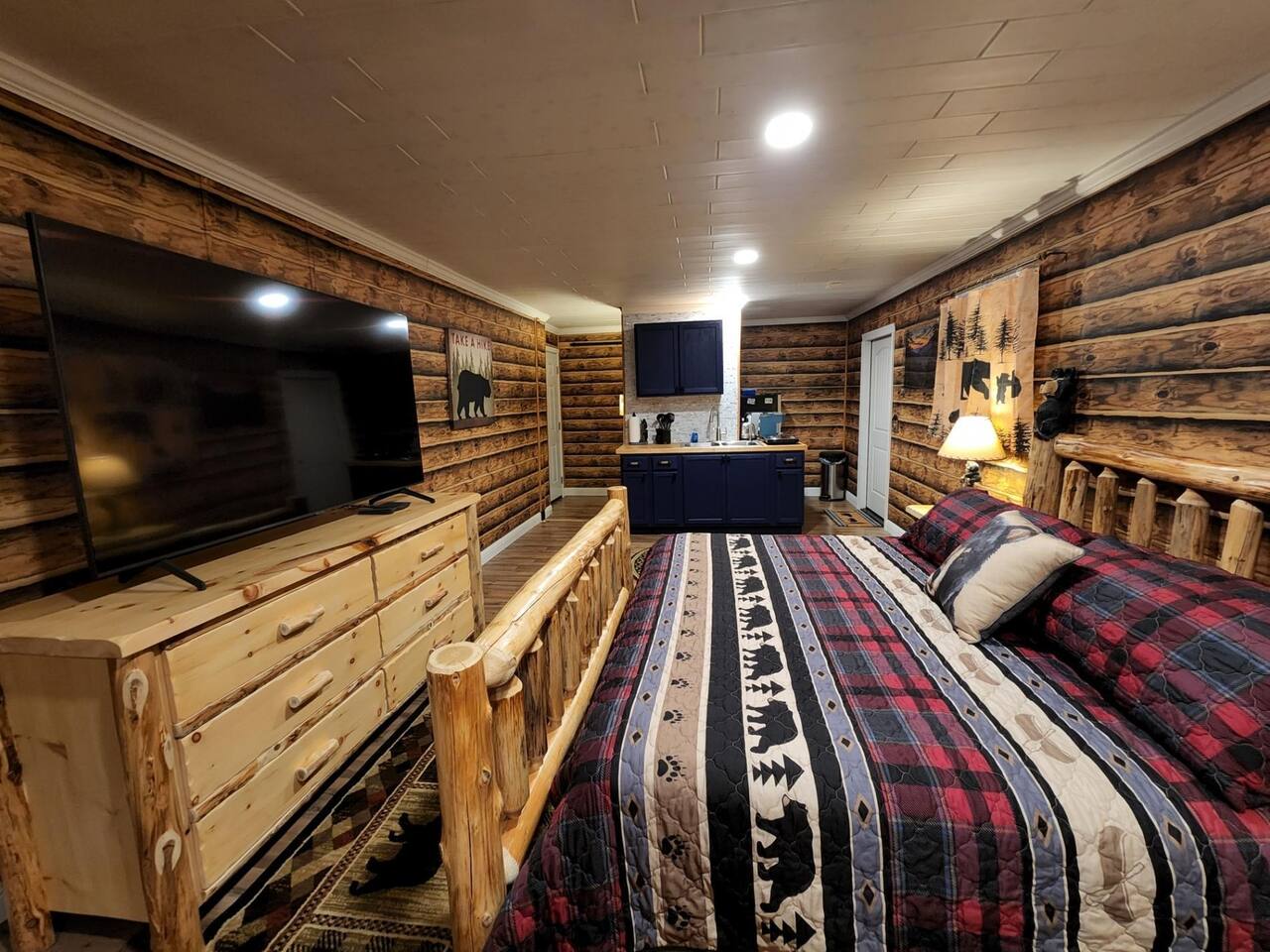 Smoky Bear Lodge is a 4-plex boutique connected lodge across from the Smokies National Park! Each room is private with no shared living spaces. We are located on US-321, which leads directly into downtown Gatlinburg (20 min). The Maddron Bald National Park trail is 1 minute away . Dogs MUST BE on the reservation. Dollywood is 35-40 mins away. There is an outdoor shared community area with Charcoal Grill, Picnic Table, Water Fall Feature, Fire Pit, and Large Game Room (In detached building)! This unit is approximately 485 sq ft, with a luxurious Stearns & Foster king size mattress and a twin over full bunk bed. All furniture is custom made from wood. Enjoy the 75" smart HDTV which has a ROKU stick and live TV options. You have the ability to connect to any of your streaming services. There is also a desk you may use. This unit has a full bathroom including a fully enclosed glass shower and one-sink vanity. We provide all bath towels, hand towels, washcloths, tissues, toilet paper, shampoo, body wash, and a hairdryer. The bathroom also includes a vanity table with a mirror and chair. The kitchen is equipped with a microwave, two-slice toaster, regular coffee maker and coffee, two-burner hot plate, and a full size refrigerator. We provide all necessary cooking implements, including silverware, utensils, pots/pans, bowls, plates, cups, and mugs. There is a kitchen table with seating for three. 3 mini golf courses and 2 lanes for bowling! Game Room - Located directly off the parking lot by the fence yard, the game room includes Pool Table, Pac-man for two, virtual pinball, 86-inch tv with live tv, air hockey, and foosball Fully Fenced Yard – Located off the parking lot and in front of the Game Room, you must keep your dog(s) on a leash when walking around the property. Fire Pit, Charcoal Grills, and Water Fall Feature: Located at the back of the property (Accessed via the gravel path by the Game Room/fenced yard entrance, and walk to the path to the back of the property – stay on the gravel path the whole way) in Fire Pit – You will need firewood and lighting sources if you decide to use the fire pit. (You can purchase across the street at Donna Jo’s Waterfall Feature – Located in the outdoor area, a rushing fountain with a bench to sit and relax (shut down in Jan and Feb or when temps below freezing) Charcoal Grills – Located in the outdoor area, there are two charcoal grills and an outdoor sink with a picnic table. Please bring charcoal and lighting sources. You can purchase across the street at Donna Jo’s *Other Units* There are three additional units available at this property. Click my profile to view the properties I have available, and view the description below for each unit: Unit 1: Sleeps two with a front deck, large bedroom, and large kitchen. Unit 3: Sleeps two, has a private back patio, a full bathtub, and a Ms. Pac-Man multi-game arcade game. Unit 4: Sleeps two with a front deck.