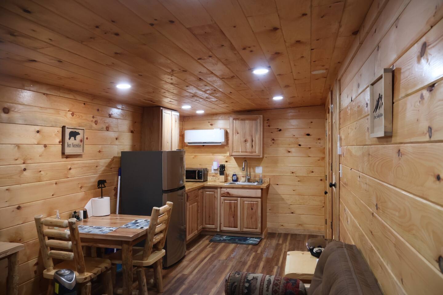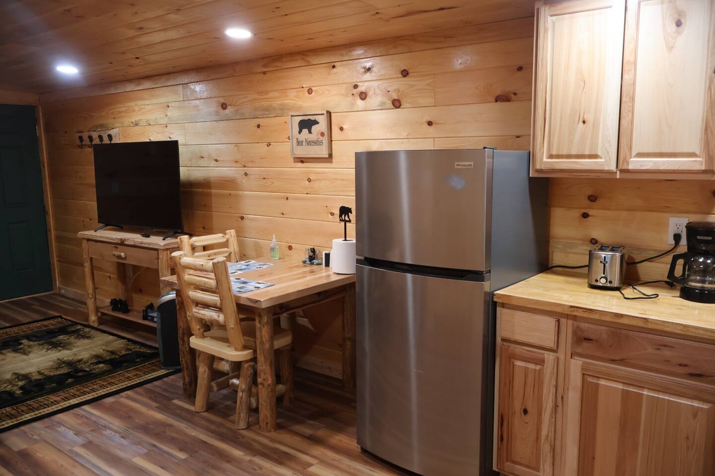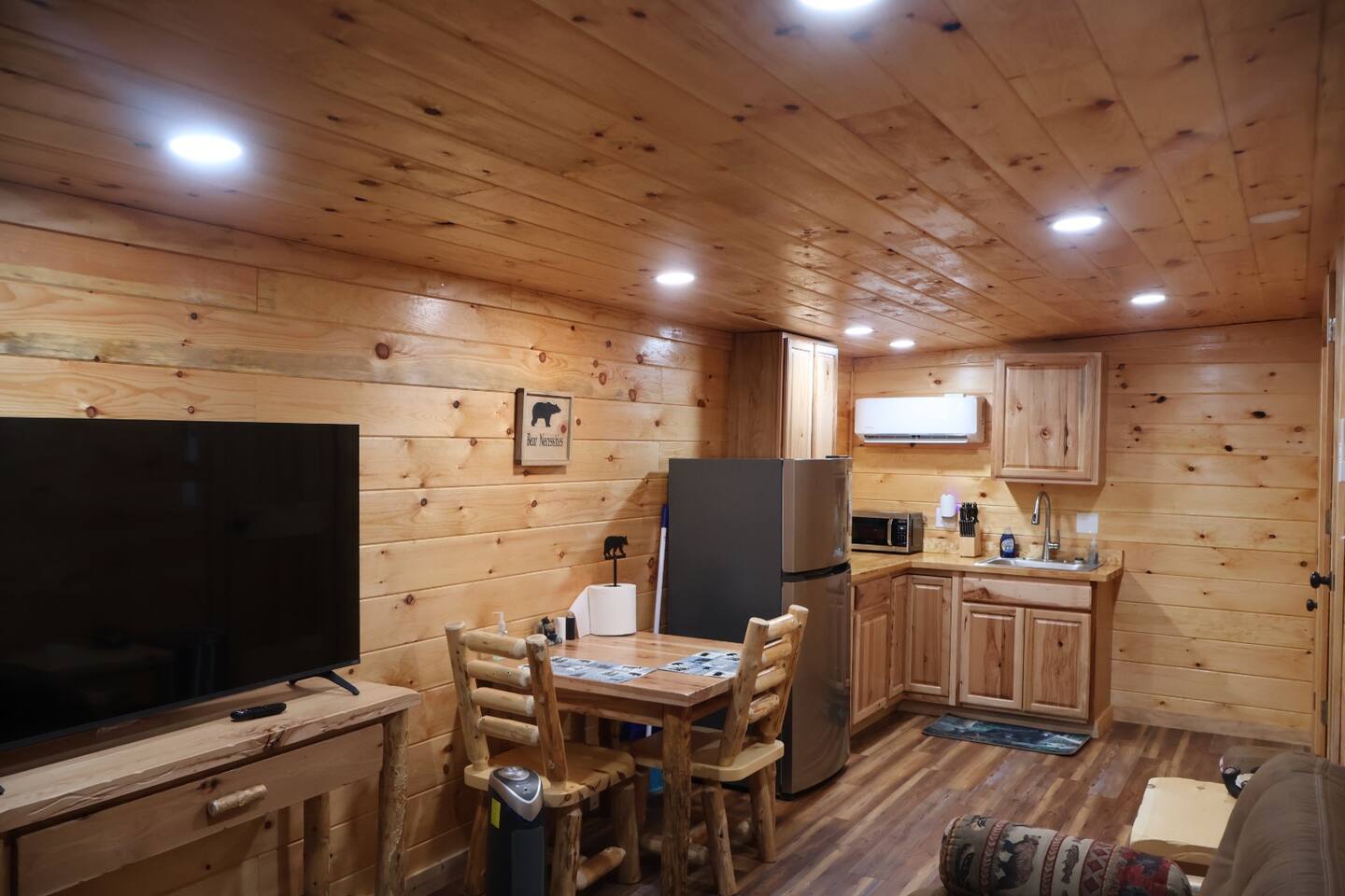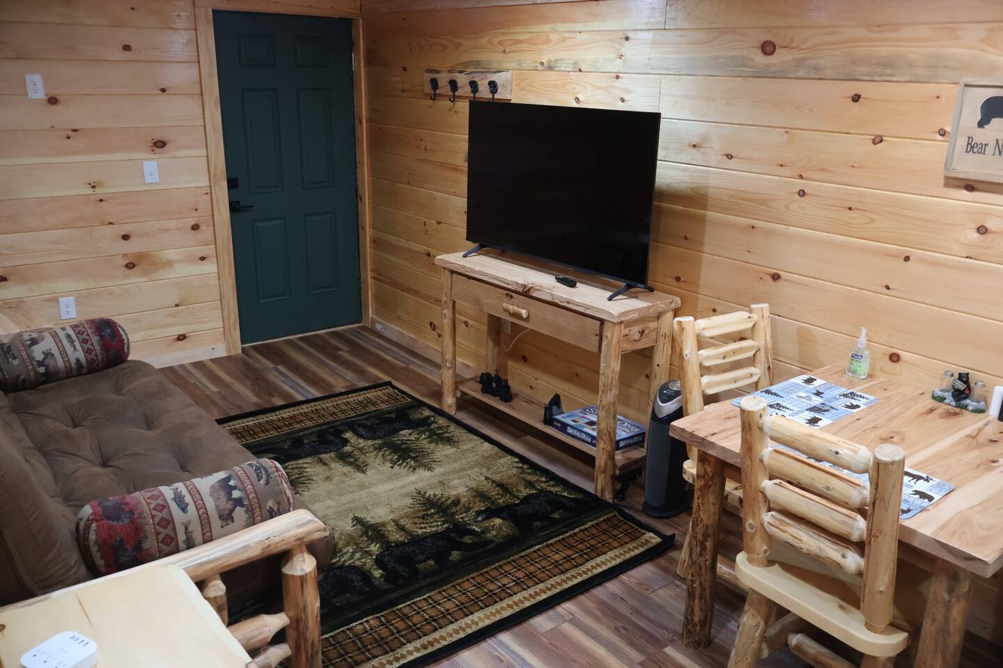 The Cozy Cabin at Smoky Bear Lodge is located on US-321 with direct access to downtown Gatlinburg (20 min). Maddron Bald Trailhead in the Great Smoky Mountains National Park is just 1 minute away. Dollywood is about 35 minutes away. Guests enjoy shared outdoor amenities including a charcoal grill, picnic table, waterfall, fire pit, and a large game room in a detached building. Other cabins share these amenities. Dogs are welcome but must be included on the reservation when booking. This Cabin is approximately 400 sq ft, with a Queen size mattress . All furniture is custom made from wood. Enjoy the 60" smart TV with Roku for you to log into your own subscription services.. There is also a desk you may use. This cabin has a full bathroom including a shower and one-sink vanity. We provide all bath towels, hand towels, washcloths, toilet paper, shampoo, body wash, and a hairdryer. The kitchen is equipped with a microwave, two-slice toaster, coffee maker and coffee, two-burner hot plate, and a full size refrigerator. We provide all necessary cooking implements, including silverware, utensils, pots/pans, bowls, plates, cups, and mugs. There is a kitchen table with seating for two. Game Room - Located directly off the parking lot by the fence yard, the game room includes Pool Table, Pac-man for two, virtual pinball, 86-inch tv with live tv, air hockey, and foosball Fully Fenced Yard – Located off the parking lot and in front of the Game Room, you must keep your dog(s) on a leash when walking around the property. Fire Pit, Charcoal Grills, and Water Fall Feature: Located at the back of the property (Accessed via the gravel path by the Game Room/fenced yard entrance, and walk to the path to the back of the property – stay on the gravel path the whole way) in Fire Pit – You will need firewood and lighting sources if you decide to use the fire pit. (You can purchase across the street at Donna Jo’s Waterfall Feature – Located in the outdoor area, a rushing fountain with a bench to sit and relax (shut down in Jan and Feb or when temps below freezing) Charcoal Grills – Located in the outdoor area, there are two charcoal grills and an outdoor sink with a picnic table. Please bring charcoal and lighting sources. You can purchase across the street at Donna Jo’s