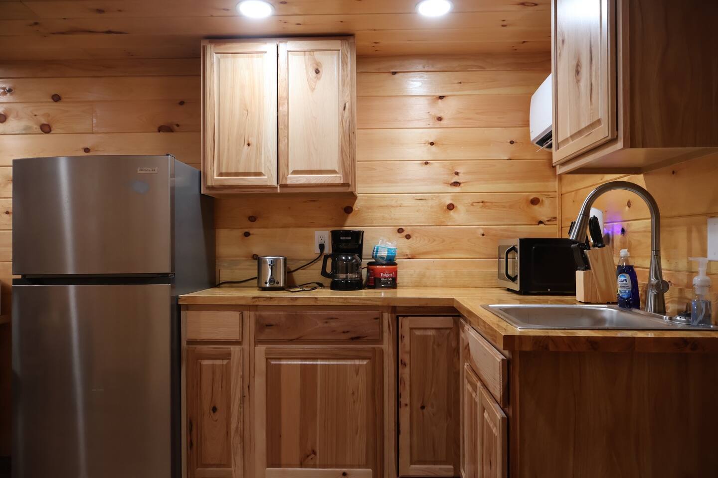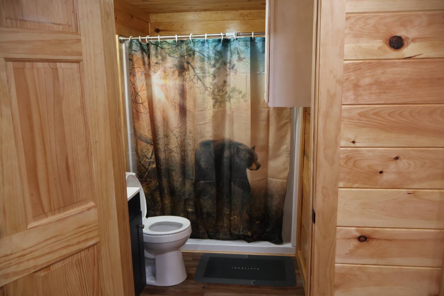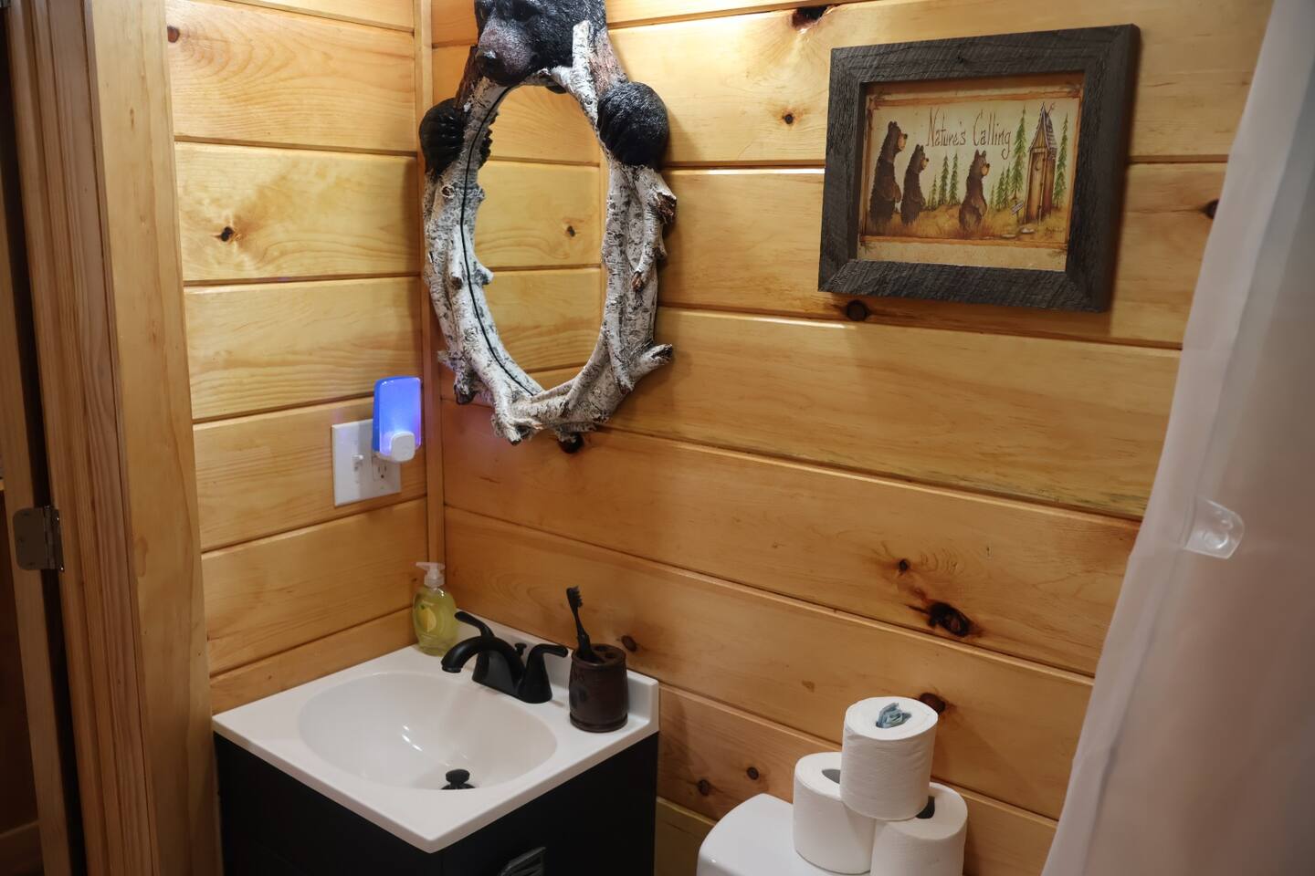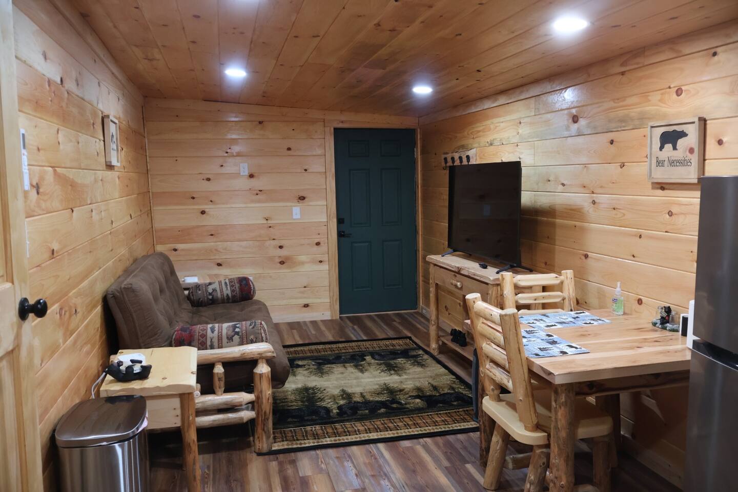 The Cozy Cabin at Smoky Bear Lodge is located on US-321 with direct access to downtown Gatlinburg (20 min). Maddron Bald Trailhead in the Great Smoky Mountains National Park is just 1 minute away. Dollywood is about 35 minutes away. Guests enjoy shared outdoor amenities including a charcoal grill, picnic table, waterfall, fire pit, and a large game room in a detached building. Other cabins share these amenities. Dogs are welcome but must be included on the reservation when booking. This Cabin is approximately 400 sq ft, with a Queen size mattress . All furniture is custom made from wood. Enjoy the 60" smart TV with Roku for you to log into your own subscription services.. There is also a desk you may use. This cabin has a full bathroom including a shower and one-sink vanity. We provide all bath towels, hand towels, washcloths, toilet paper, shampoo, body wash, and a hairdryer. The kitchen is equipped with a microwave, two-slice toaster, coffee maker and coffee, two-burner hot plate, and a full size refrigerator. We provide all necessary cooking implements, including silverware, utensils, pots/pans, bowls, plates, cups, and mugs. There is a kitchen table with seating for two. Game Room - Located directly off the parking lot by the fence yard, the game room includes Pool Table, Pac-man for two, virtual pinball, 86-inch tv with live tv, air hockey, and foosball Fully Fenced Yard – Located off the parking lot and in front of the Game Room, you must keep your dog(s) on a leash when walking around the property. Fire Pit, Charcoal Grills, and Water Fall Feature: Located at the back of the property (Accessed via the gravel path by the Game Room/fenced yard entrance, and walk to the path to the back of the property – stay on the gravel path the whole way) in Fire Pit – You will need firewood and lighting sources if you decide to use the fire pit. (You can purchase across the street at Donna Jo’s Waterfall Feature – Located in the outdoor area, a rushing fountain with a bench to sit and relax (shut down in Jan and Feb or when temps below freezing) Charcoal Grills – Located in the outdoor area, there are two charcoal grills and an outdoor sink with a picnic table. Please bring charcoal and lighting sources. You can purchase across the street at Donna Jo’s