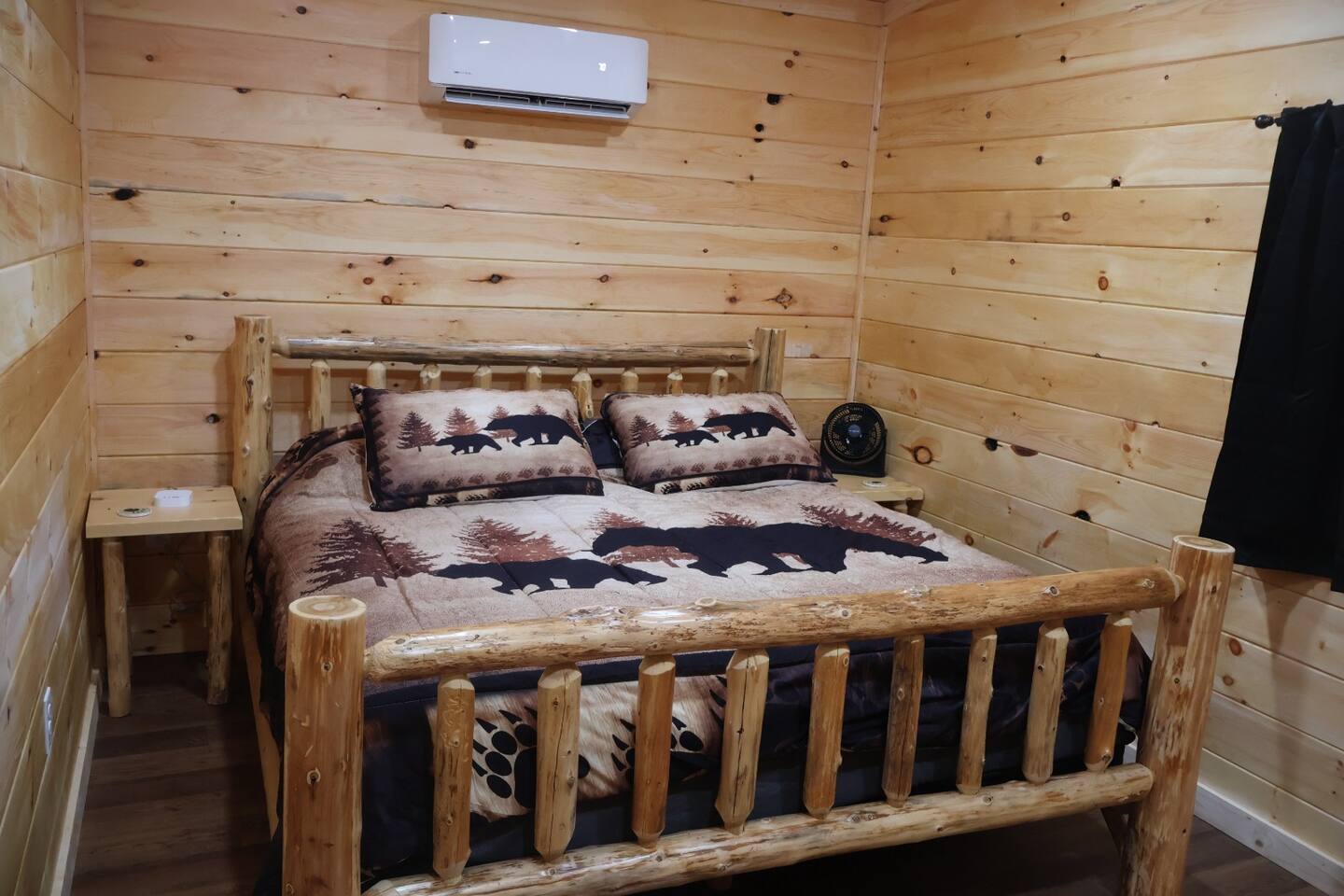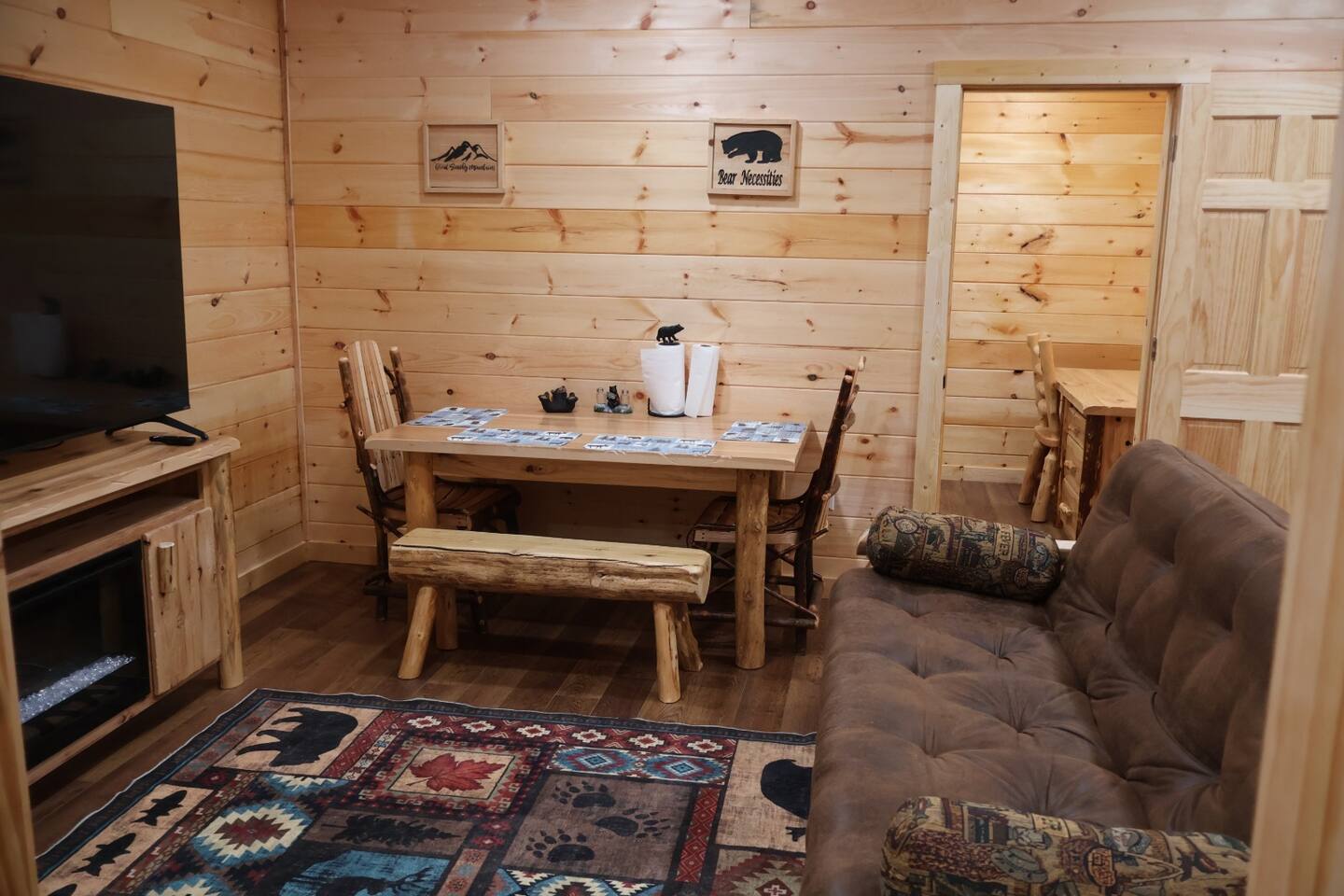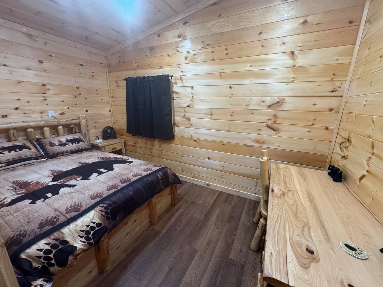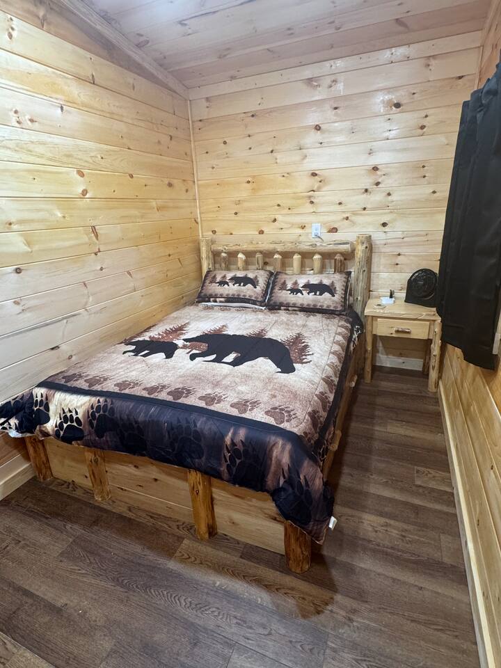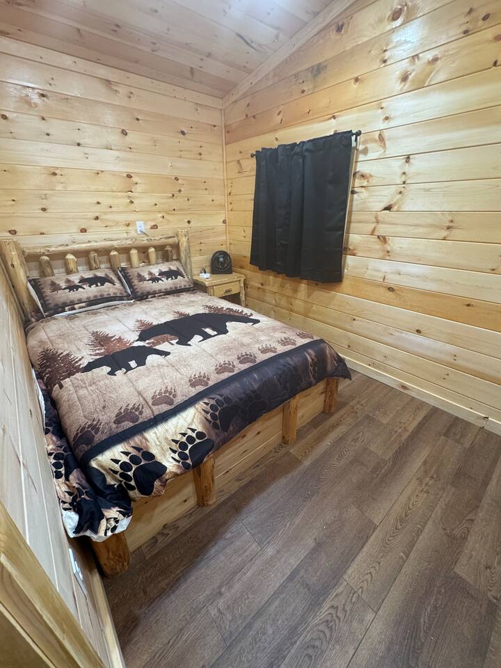 Smoky Bear Cabin is a private 2 bedroom new cabin with a private fenced in front yard, situated behind the Smoky Bear Lodge. It is located on US-321, which leads directly into downtown Gatlinburg (20 min) Dogs MUST BE on the reservation when booking. Maddron bald trail 1 min away.Dollywood is 35-40 mins away. There is an outdoor shared community area with Charcoal Grill, Picnic Table, Water Fall, Fire Pit, and Large Game Room (In detached building)!! Enjoy 3 Mini golf holes and outdoor bowling! This Cabin is approximately 680 sq ft, with a King size mattress and closet in the main bedroom. In the second bedroom there is a queen side bed with an office desk . All furniture is custom made from wood. Enjoy the 70 inch smart TV with Roku for you to log into your own subscription services. You have a full private fenced yard in the front (keep gate closed at all times). This cabin has a full bathroom including a shower and one-sink vanity. We provide all bath towels, hand towels, washcloths, toilet paper, shampoo, body wash, and a hairdryer. The kitchen is equipped with a microwave, two-slice toaster, coffee maker and coffee, two-burner hot plate, and a full size refrigerator. We provide all necessary cooking implements, including silverware, utensils, pots/pans, bowls, plates, cups, and mugs. There is a kitchen table with seating for 4 Game Room - Located directly off the parking lot by the shared fenced yard, the game room includes Pool Table, Pac-man for two, virtual pinball, 86-inch tv with live tv, air hockey, and foosball! 3 mini golf courses and 2 lanes for bowling! Fire Pit, Charcoal Grills, and Water Fall Feature: Located at the back of the property (Accessed via the gravel path by the Game Room/fenced yard entrance, and walk to the path to the back of the property โ stay on the gravel path the whole way) in Fire Pit โ You will need firewood and lighting sources if you decide to use the fire pit. (You can purchase across the street at Donna Joโs Waterfall Feature โ Located in the outdoor area, a rushing fountain with a bench to sit and relax (shut down in Jan and Feb or when temps below freezing) Charcoal Grills โ Located in the outdoor area, there are two charcoal grills and an outdoor sink with a picnic table. Please bring charcoal and lighting sources. You can purchase across the street at Donna Joโs