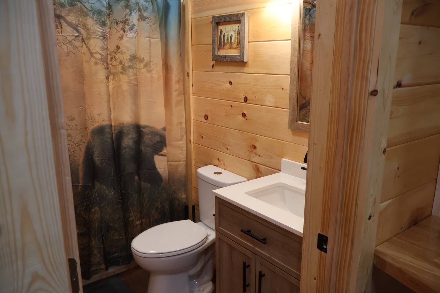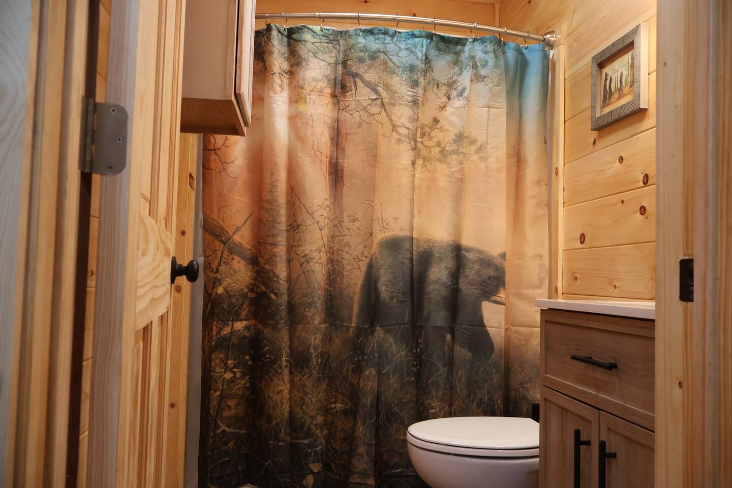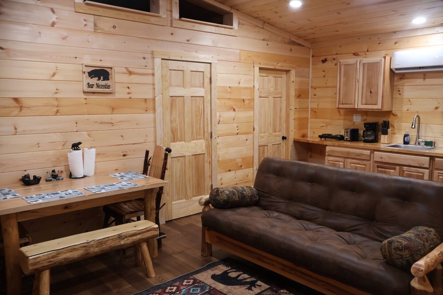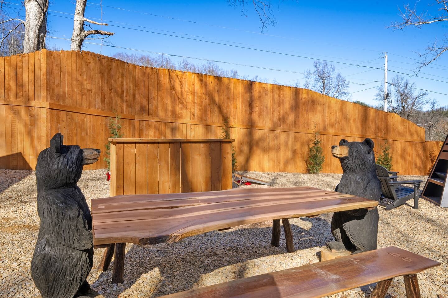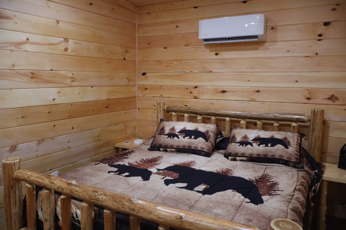 Smoky Bear Cabin is a private 2 bedroom new cabin with a private fenced in front yard, situated behind the Smoky Bear Lodge. It is located on US-321, which leads directly into downtown Gatlinburg (20 min) Dogs MUST BE on the reservation when booking. Maddron bald trail 1 min away.Dollywood is 35-40 mins away. There is an outdoor shared community area with Charcoal Grill, Picnic Table, Water Fall, Fire Pit, and Large Game Room (In detached building)!! Enjoy 3 Mini golf holes and outdoor bowling! This Cabin is approximately 680 sq ft, with a King size mattress and closet in the main bedroom. In the second bedroom there is a queen side bed with an office desk . All furniture is custom made from wood. Enjoy the 70 inch smart TV with Roku for you to log into your own subscription services. You have a full private fenced yard in the front (keep gate closed at all times). This cabin has a full bathroom including a shower and one-sink vanity. We provide all bath towels, hand towels, washcloths, toilet paper, shampoo, body wash, and a hairdryer. The kitchen is equipped with a microwave, two-slice toaster, coffee maker and coffee, two-burner hot plate, and a full size refrigerator. We provide all necessary cooking implements, including silverware, utensils, pots/pans, bowls, plates, cups, and mugs. There is a kitchen table with seating for 4 Game Room - Located directly off the parking lot by the shared fenced yard, the game room includes Pool Table, Pac-man for two, virtual pinball, 86-inch tv with live tv, air hockey, and foosball! 3 mini golf courses and 2 lanes for bowling! Fire Pit, Charcoal Grills, and Water Fall Feature: Located at the back of the property (Accessed via the gravel path by the Game Room/fenced yard entrance, and walk to the path to the back of the property โ stay on the gravel path the whole way) in Fire Pit โ You will need firewood and lighting sources if you decide to use the fire pit. (You can purchase across the street at Donna Joโs Waterfall Feature โ Located in the outdoor area, a rushing fountain with a bench to sit and relax (shut down in Jan and Feb or when temps below freezing) Charcoal Grills โ Located in the outdoor area, there are two charcoal grills and an outdoor sink with a picnic table. Please bring charcoal and lighting sources. You can purchase across the street at Donna Joโs