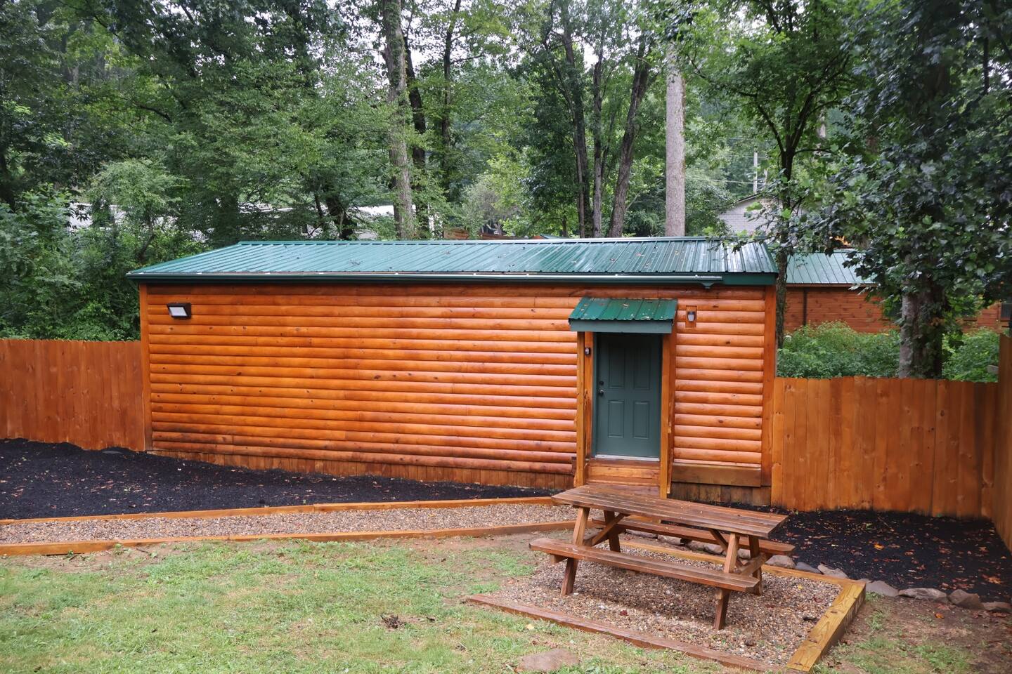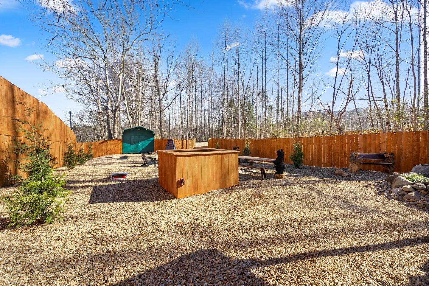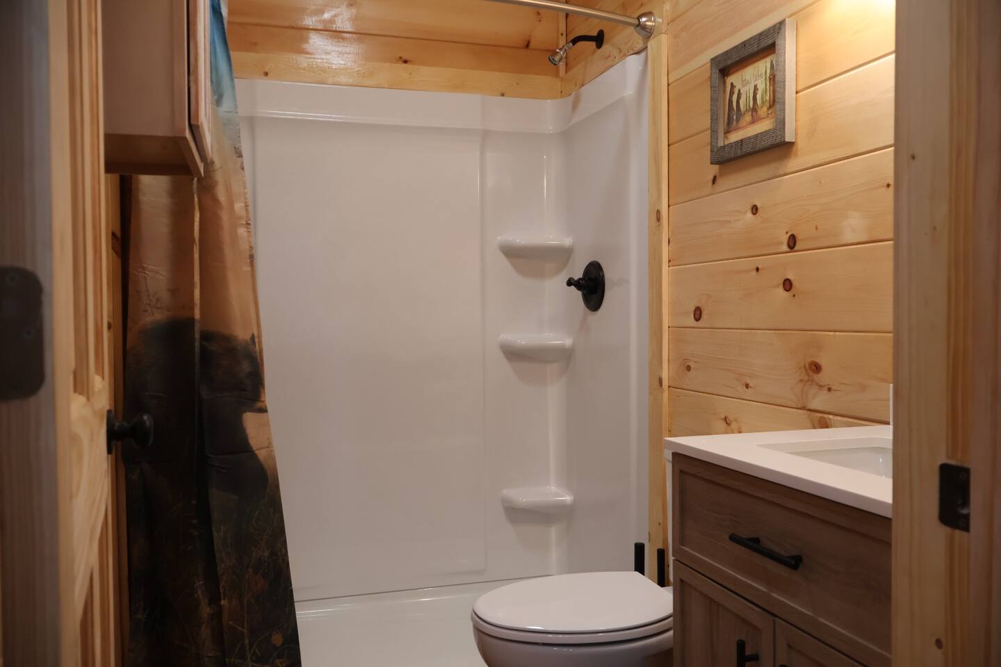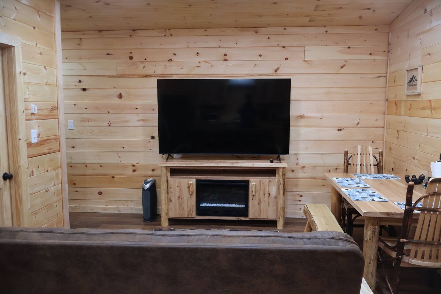 Smoky Bear Cabin is a private 2 bedroom new cabin with a private fenced in front yard, situated behind the Smoky Bear Lodge. It is located on US-321, which leads directly into downtown Gatlinburg (20 min) Dogs MUST BE on the reservation when booking. Maddron bald trail 1 min away.Dollywood is 35-40 mins away. There is an outdoor shared community area with Charcoal Grill, Picnic Table, Water Fall, Fire Pit, and Large Game Room (In detached building)!! Enjoy 3 Mini golf holes and outdoor bowling! This Cabin is approximately 680 sq ft, with a King size mattress and closet in the main bedroom. In the second bedroom there is a queen side bed with an office desk . All furniture is custom made from wood. Enjoy the 70 inch smart TV with Roku for you to log into your own subscription services. You have a full private fenced yard in the front (keep gate closed at all times). This cabin has a full bathroom including a shower and one-sink vanity. We provide all bath towels, hand towels, washcloths, toilet paper, shampoo, body wash, and a hairdryer. The kitchen is equipped with a microwave, two-slice toaster, coffee maker and coffee, two-burner hot plate, and a full size refrigerator. We provide all necessary cooking implements, including silverware, utensils, pots/pans, bowls, plates, cups, and mugs. There is a kitchen table with seating for 4 Game Room - Located directly off the parking lot by the shared fenced yard, the game room includes Pool Table, Pac-man for two, virtual pinball, 86-inch tv with live tv, air hockey, and foosball! 3 mini golf courses and 2 lanes for bowling! Fire Pit, Charcoal Grills, and Water Fall Feature: Located at the back of the property (Accessed via the gravel path by the Game Room/fenced yard entrance, and walk to the path to the back of the property โ stay on the gravel path the whole way) in Fire Pit โ You will need firewood and lighting sources if you decide to use the fire pit. (You can purchase across the street at Donna Joโs Waterfall Feature โ Located in the outdoor area, a rushing fountain with a bench to sit and relax (shut down in Jan and Feb or when temps below freezing) Charcoal Grills โ Located in the outdoor area, there are two charcoal grills and an outdoor sink with a picnic table. Please bring charcoal and lighting sources. You can purchase across the street at Donna Joโs
