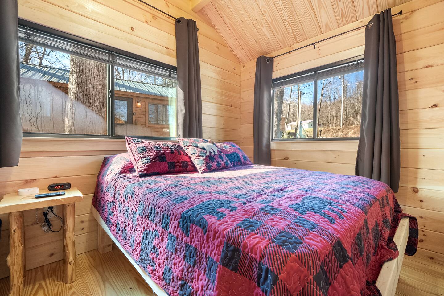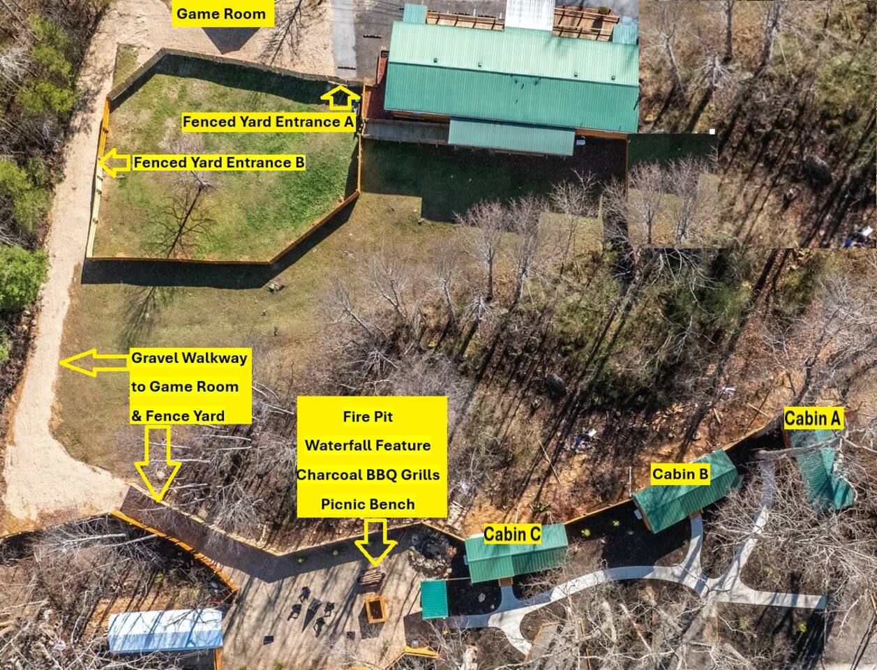 You will have the entire cabin to yourself. There is outdoor parking for one vehicle. Access to the outdoor recreation area, fenced yard, and game room are shared with the other rentals in the community.