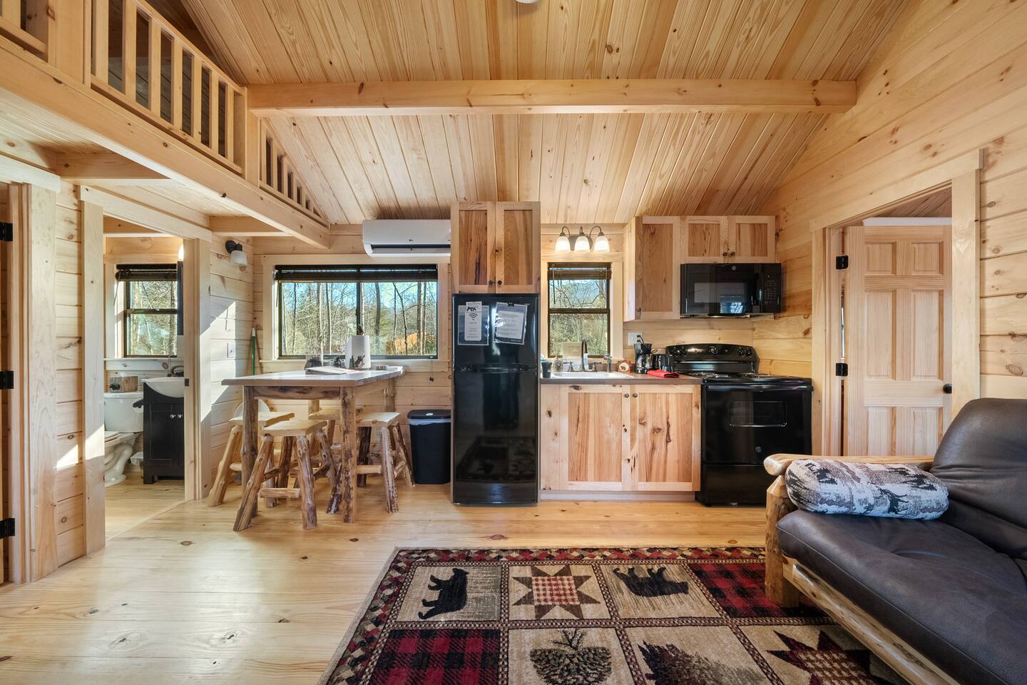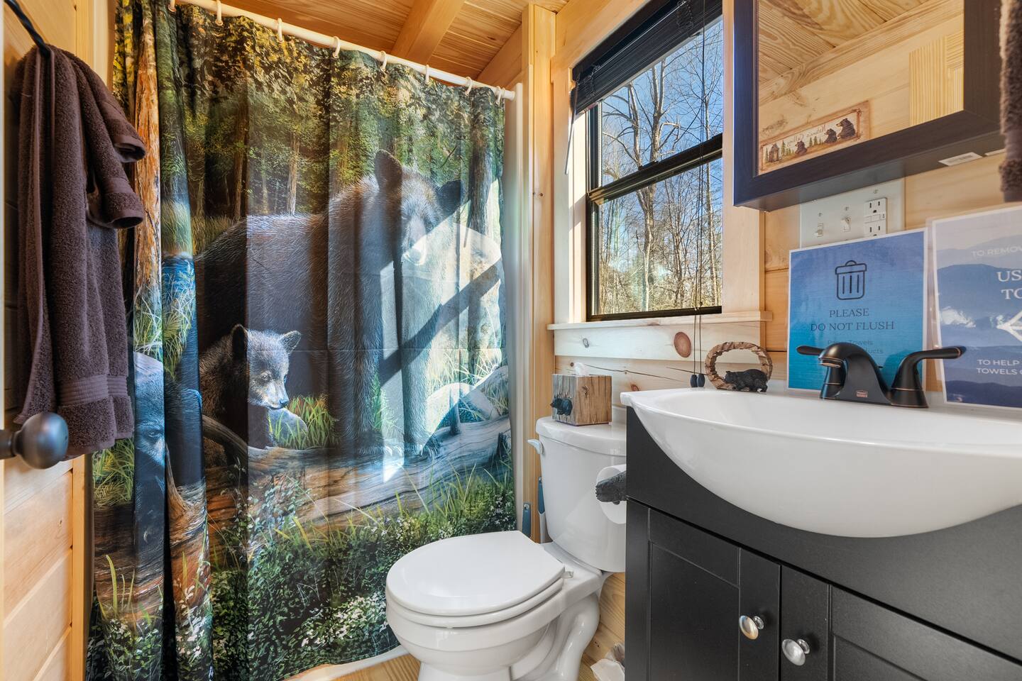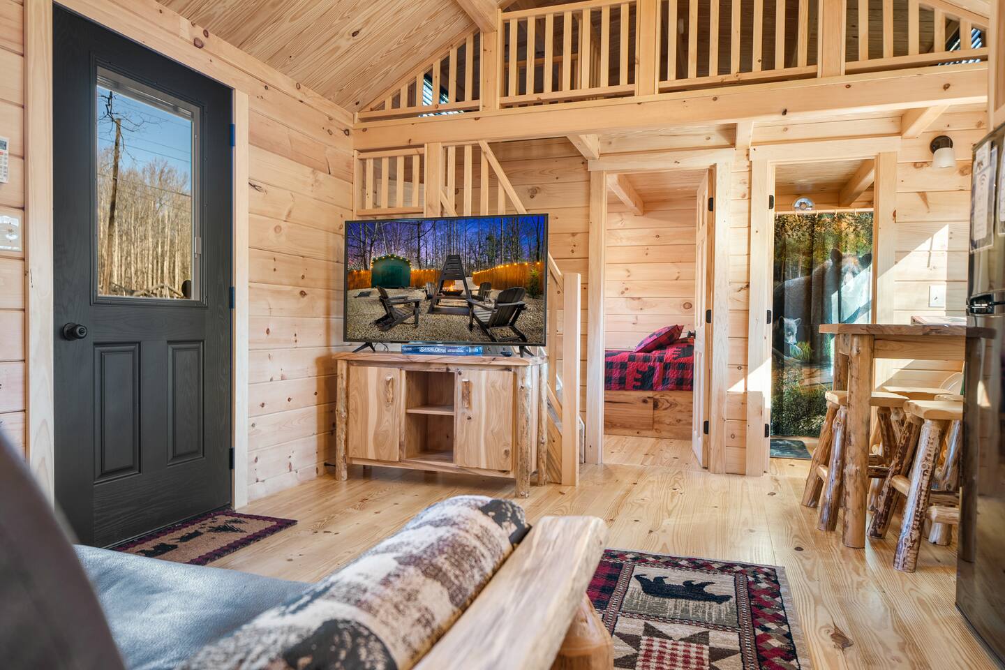 We are located off a back road directly behind HWY US-321, 20 minutes to Gatlinburg. There are two other cabins in this small community. There is an outdoor shared community area with Charcoal Grills, Picnic Table, Water Fall Feature, Fire Pit, and Large Game Room! The Maddron Bald National Park trail is 1 minute away and leads to the Appalachian Trail. We are 10 minutes from Cosby and Greenbrier Park entrances!! This cozy cabin is brand new and built by the Amish. This is the perfect couples cabin located 20 minutes to downtown Gatlinburg and 35 minutes to Pigeon Forge. There is a National Park trail 1 minute away (Maddron bald trailhead.) a Gas station, and Dollar General are also a minute away and very convenient for groceries, lunch, or coffee. 3 mini golf courses and 2 lanes for bowling! The whole property consists of three cabins and a four-room cabin on the other side of the property. All the living space is completely private. The outdoor amenities are shared with other guests and include the following: • Game Room - Located behind the property, and approximately a 2 minute walk across the property, the game room includes Pool Table, Pac-man for two, virtual pinball, 86-inch tv with live tv, air hockey, and foosball • Fully Fenced Yard – Located a few hundred yards from the cabin • Fire Pit – Located in the outdoor area, you will need firewood and lighting sources if you decide to use the fire pit. • Waterfall Feature – Located in the outdoor area, a rushing fountain with a bench to sit and relax (shut down in Jan and Feb or when temps below freezing) • Charcoal Grill – Located in the outdoor area, there are two charcoal grills and an outdoor sink with a picnic table. Please bring charcoal and lighting sources. Inside the private cabin is a futon, dining area, kitchen, oven and stovetop, full sized bathroom, and shower. All furniture is brand new, and custom made from wood by the Amish. Enjoy watching the 46-inch smart HDTV’s (one in living room and one in bedroom) you can stream your favorite shows using the high-speed Wi-Fi or use the live TV options on ROKU.. There is also a private Pac-man game and a full-sized desk to work on. The kitchen includes a two-slice toaster, a coffee pot, microwave, refrigerator/freezer, and stovetop. The kitchen is fully stocked with pots, pans, plates, bowls, mugs, silverware, and any other cooking utensils you require. Suggested items to bring with you: bug spray, firewood, kindling/lighters for the fire pit, and charcoal for grill.