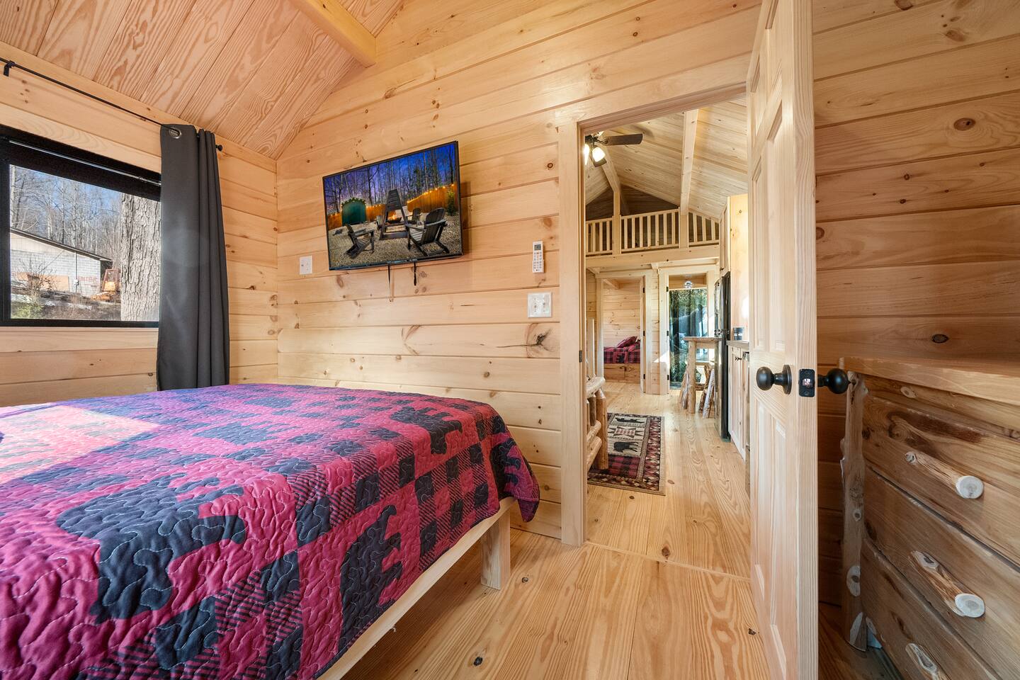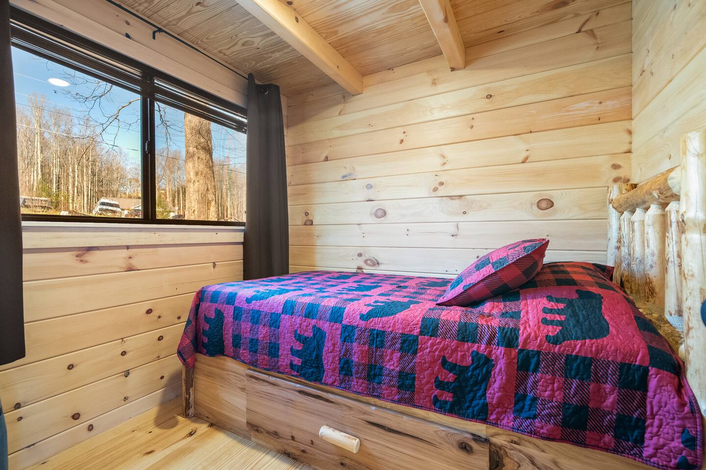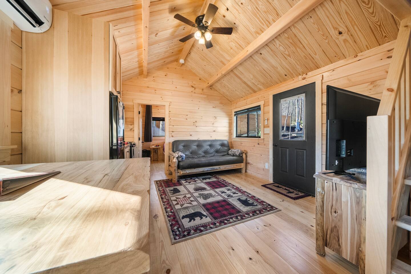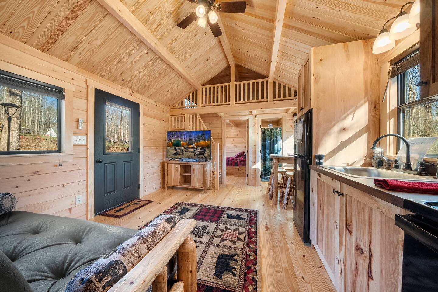 We are located off a back road directly behind HWY US-321, 20 minutes to Gatlinburg. There are two other cabins in this small community. There is an outdoor shared community area with Charcoal Grills, Picnic Table, Water Fall Feature, Fire Pit, and Large Game Room! The Maddron Bald National Park trail is 1 minute away and leads to the Appalachian Trail. We are 10 minutes from Cosby and Greenbrier Park entrances!! This cozy cabin is brand new and built by the Amish. This is the perfect couples cabin located 20 minutes to downtown Gatlinburg and 35 minutes to Pigeon Forge. There is a National Park trail 1 minute away (Maddron bald trailhead.) a Gas station, and Dollar General are also a minute away and very convenient for groceries, lunch, or coffee. 3 mini golf courses and 2 lanes for bowling! The whole property consists of three cabins and a four-room cabin on the other side of the property. All the living space is completely private. The outdoor amenities are shared with other guests and include the following: • Game Room - Located behind the property, and approximately a 2 minute walk across the property, the game room includes Pool Table, Pac-man for two, virtual pinball, 86-inch tv with live tv, air hockey, and foosball • Fully Fenced Yard – Located a few hundred yards from the cabin • Fire Pit – Located in the outdoor area, you will need firewood and lighting sources if you decide to use the fire pit. • Waterfall Feature – Located in the outdoor area, a rushing fountain with a bench to sit and relax (shut down in Jan and Feb or when temps below freezing) • Charcoal Grill – Located in the outdoor area, there are two charcoal grills and an outdoor sink with a picnic table. Please bring charcoal and lighting sources. Inside the private cabin is a futon, dining area, kitchen, oven and stovetop, full sized bathroom, and shower. All furniture is brand new, and custom made from wood by the Amish. Enjoy watching the 46-inch smart HDTV’s (one in living room and one in bedroom) you can stream your favorite shows using the high-speed Wi-Fi or use the live TV options on ROKU.. There is also a private Pac-man game and a full-sized desk to work on. The kitchen includes a two-slice toaster, a coffee pot, microwave, refrigerator/freezer, and stovetop. The kitchen is fully stocked with pots, pans, plates, bowls, mugs, silverware, and any other cooking utensils you require. Suggested items to bring with you: bug spray, firewood, kindling/lighters for the fire pit, and charcoal for grill.